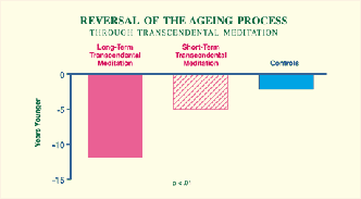 People practising Transcendental Meditation for longer than five years showed a biological age 12 years younger than their actual age—significantly different from short-term meditators and non-meditating controls. These results indicate the development of health and the promotion of longevity through Maharishi’s Transcendental Meditation Programme. Reference: International Journal of Neuroscience 16 (1982): 53–58.