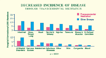A study of health insurance statistics on over 2,000 people practising Maharishi’s Transcendental Meditation and TM-Sidhi Programme over a five-year period found that participants required much less medical treatment in all 16 major disease categories. Reference: Psychosomatic Medicine 49(1) (1987): 493–507.