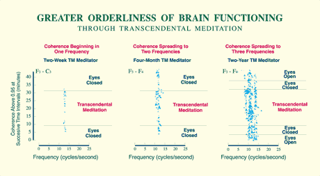 EEG coherence increases during the practice of the Transcendental Meditation Technique. This indicates greater orderliness of brain functioning. EEG coherence has been found to be correlated with higher levels of creativity, intelligence, moral reasoning, neuromuscular efficiency, and with experiences of higher states of consciousness. References: Proceedings of the San Diego Biomedical Symposium 15 (1976): 237–247; Psychosomatic Medicine 46(3) (1984): 267–276; International Journal of Neuroscience 14 (1981): 147–151.