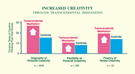 This study used the Torrance Tests of Creative Thinking to measure figural and verbal creativity in a control group and in a group which subsequently learnt Maharishi’s Transcendental Meditation Technique. Students who learnt Transcendental Meditation showed increased creativity over a five-month period. Reference: The Journal of Creative Behavior 13(3) (1979): 169–180.