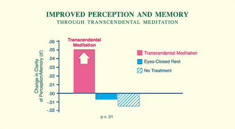 Students who were instructed in Maharishi's Transcendental Meditation Technique showed significant improvements in clarity of perception and memory over a two-week period. Controls who sat with eyes closed twice daily, or who made no change in their routines, showed no change. Reference: Memory and Cognition 10(3) (1982): 207-215.
