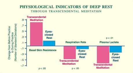Meta-analysis is a procedure for drawing definitive conclusions from large bodies of research studies. A meta-analysis of 31 studies found that Maharishi's Transcendental Meditation Programme produces over three times the degree of deep rest as does just sitting with eyes closed, as measured by basal skin resistance, respiration rate, and plasma lactate. Lower plasma lactate indicates profound relaxation, since high concentrations of lactate have been associated with high anxiety and high blood pressure. Increased basal skin resistance during Transcendental Meditation indicates a lowering of tension, while decreased respiration rate reflects greater relaxation. Reference: American Psychologist 42 (1987): 879–881.